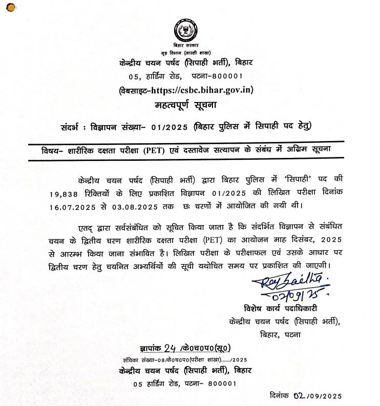Bihar Police Constable Physical Date 2025: क्या आपने बिहार पुलिस कांस्टेबल के पदों पर भर्ती के लिए ऑनलाइन आवेदन फॉर्म भरा था और आपने 16 जुलाई 2025 से लेकर 3 अगस्त 2025 तक केंद्रीय चयन पर्षद द्वारा आयोजित की जाने वाली इसकी पहले चारण की लिखित परीक्षा को दिया है और अब आप इसकी दूसरे चरण की शारीरिक परीक्षा का इंतजार कर रहे हैं, तो हम आपको बता दें कि केंद्रीय चयन पर्षद द्वारा जारी किए गए ऑफिशियल नोटिफिकेशन के अनुसार शारीरिक परीक्षा दिसंबर माह में आयोजित की जाएगी।